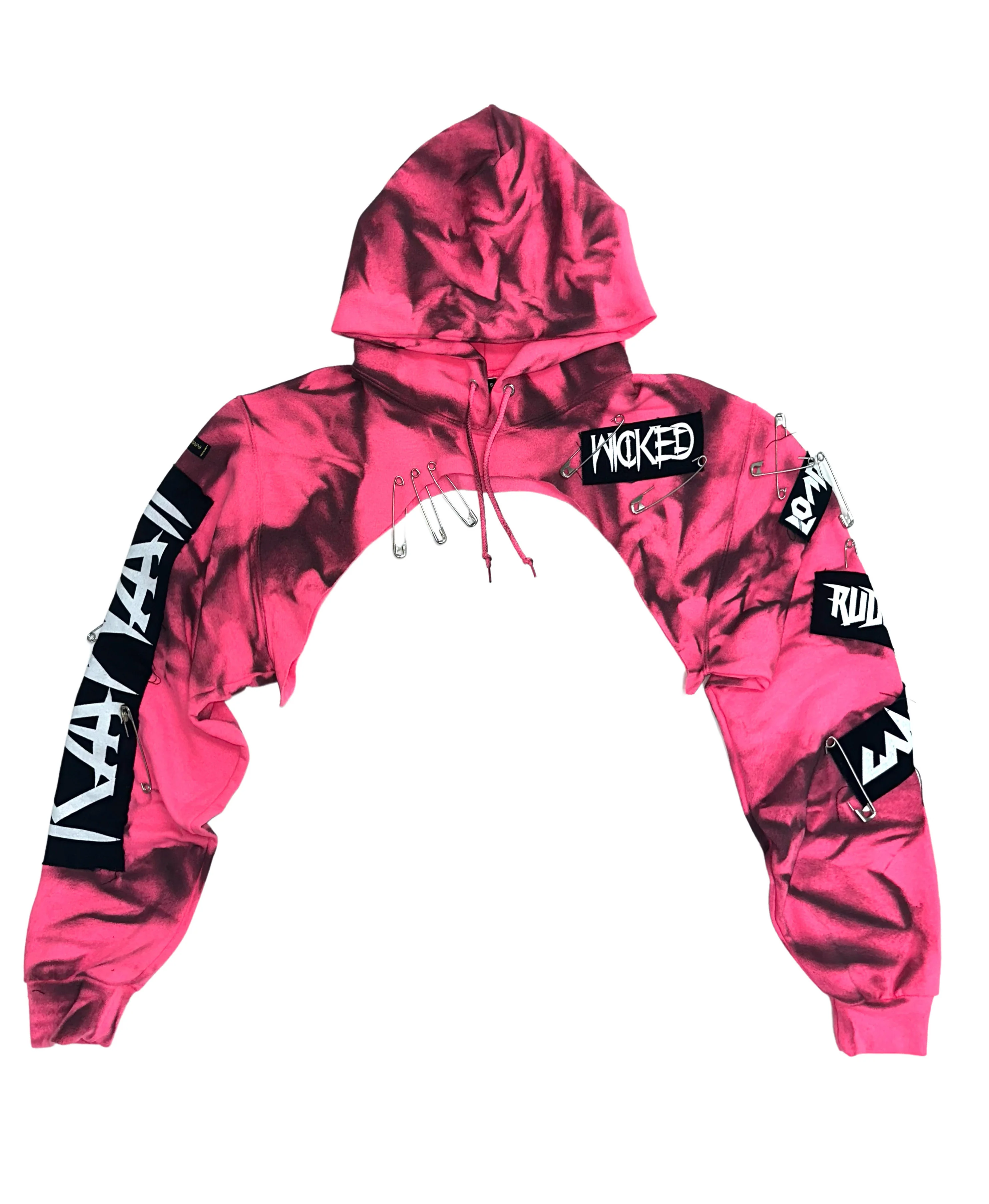 Reworked hoodie, embellished with canvas patches & safety pins.