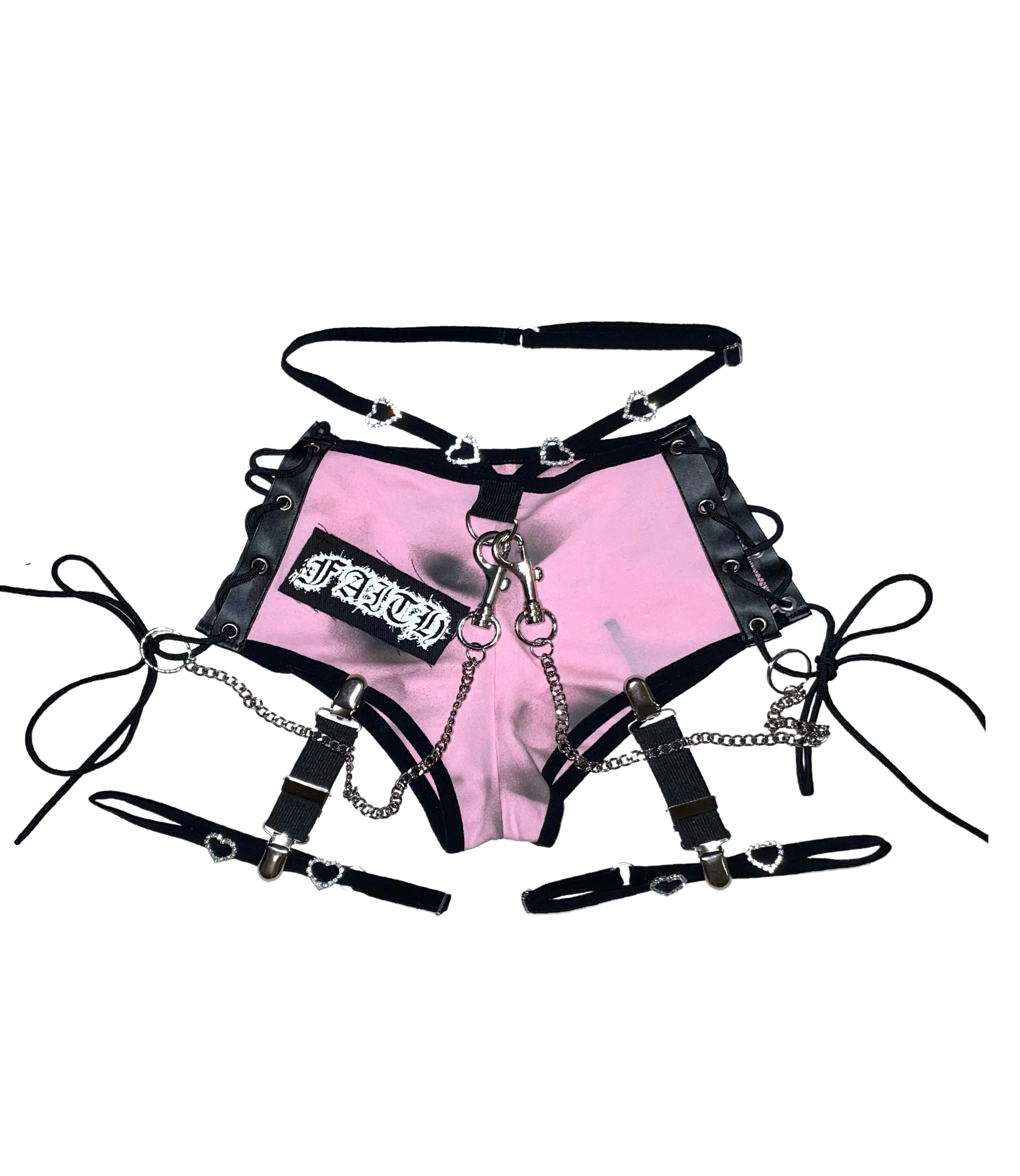 These MINI SHORTS are made out of cotton stretchy fabric with adjustable straps at the waist and adjustable laces on the sides. This item includes SHORTS, SUSPENDERS, & GARTERS.
