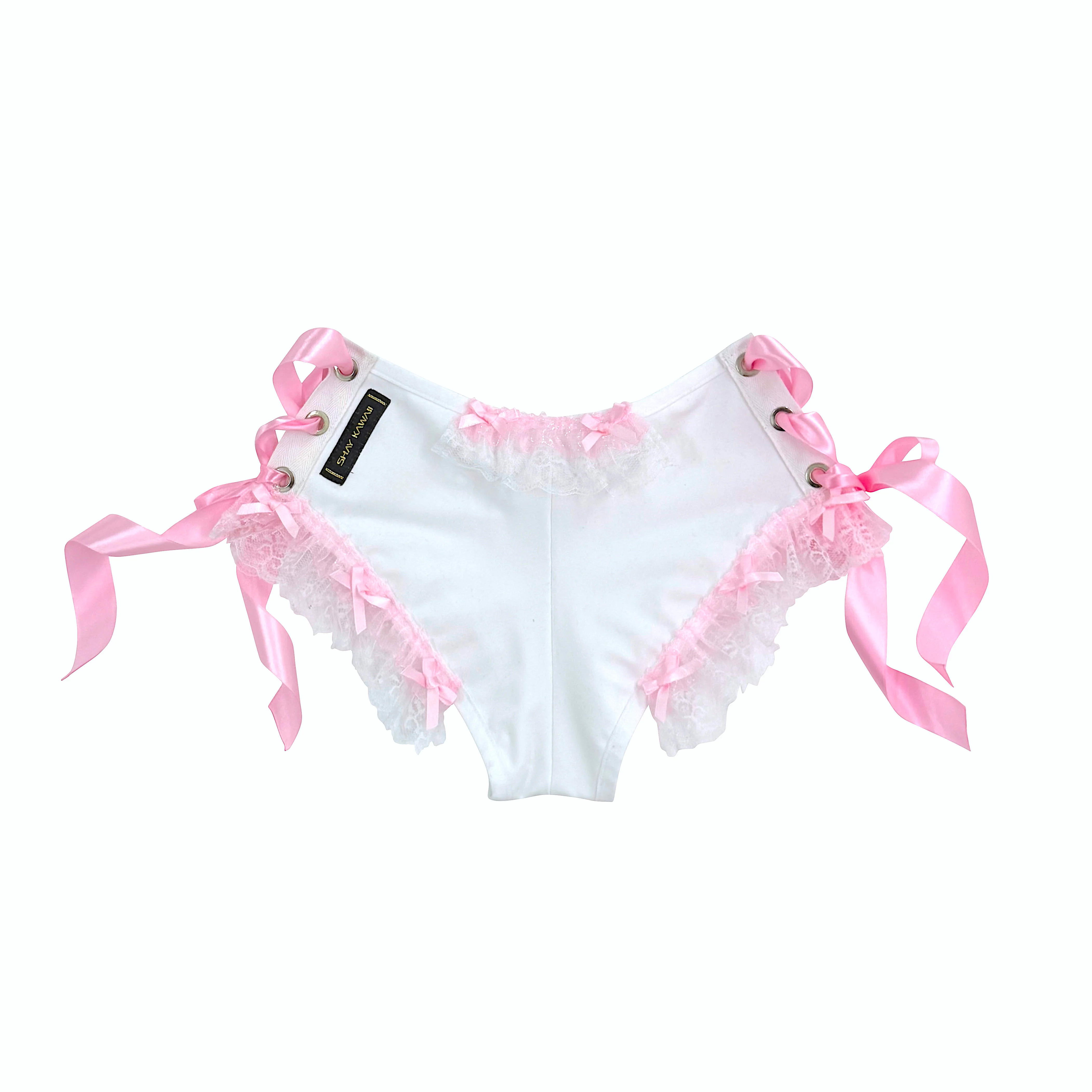 These shorts are made from a soft stretchy fabric. Embellished with a pink ruffle lace trim and satin lace-up ribbons. This design references the opulence of Marie Antoinette’s wardrobe but with a Kawaii twist!