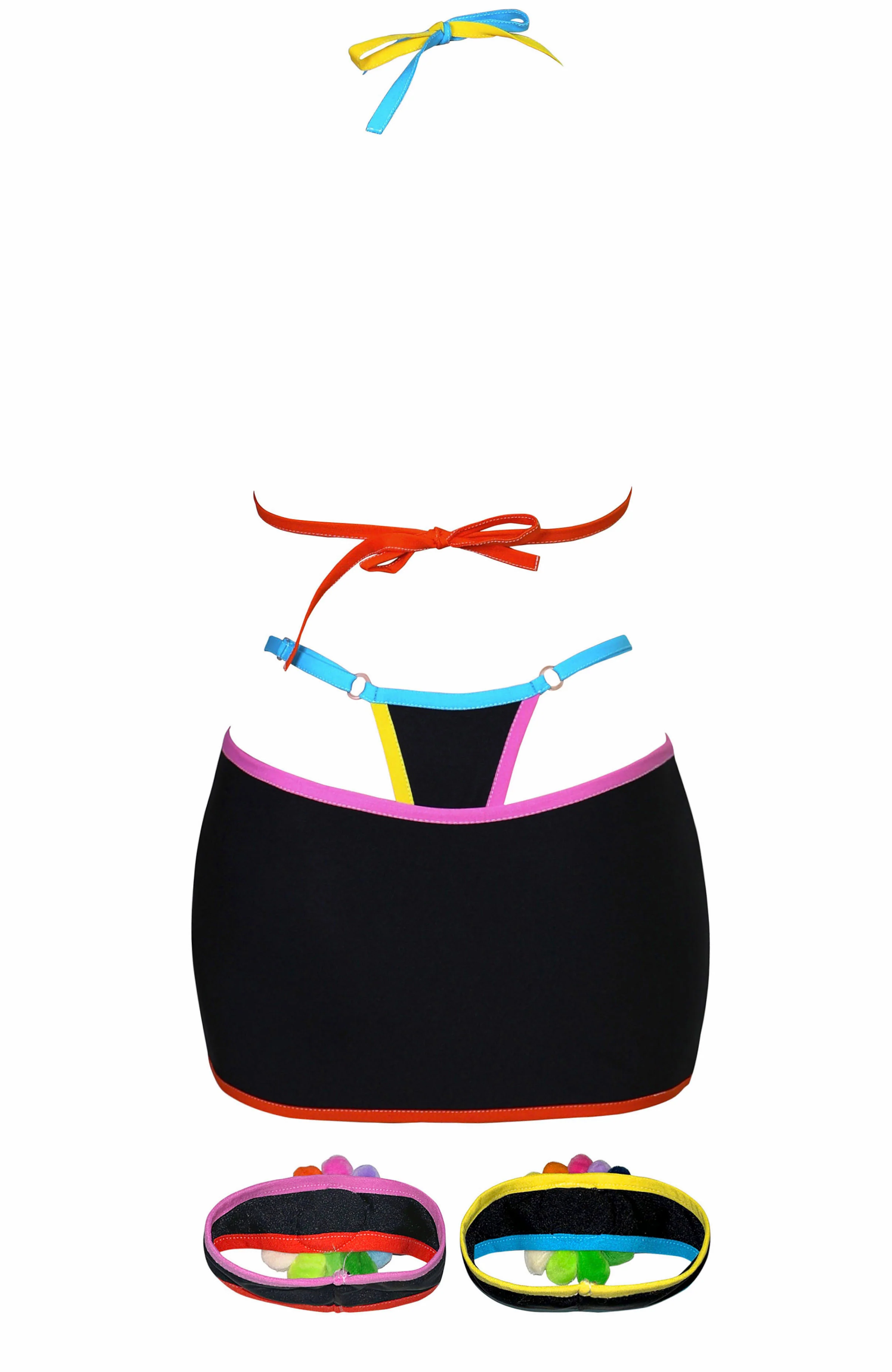 This bikini set is made out of a stretchy spandex fabric with multicolor trim to complete our Rainbow Flower FANTASY! Four soft rainbow flower plushies are stitched into this set, 2 on the bra and 2 on the garters.