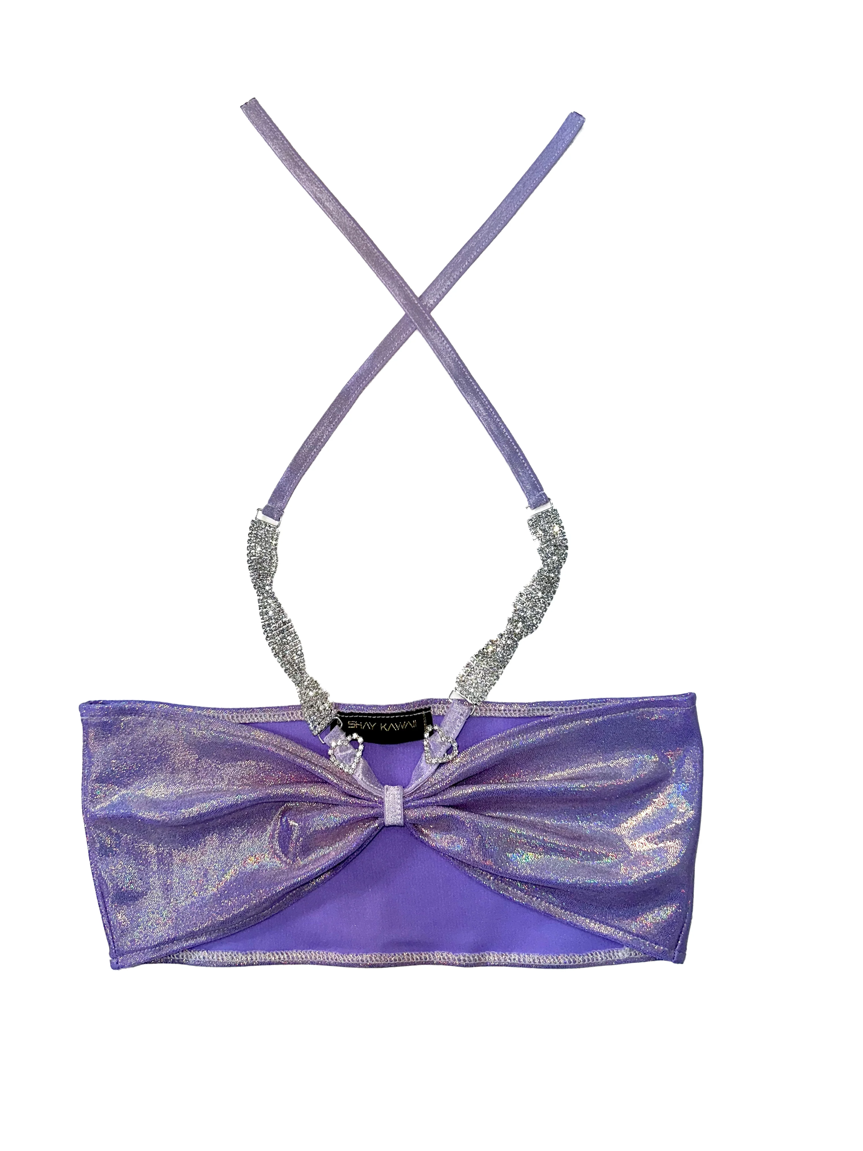 This top is made from a stretchy fabric. Embellished with straps and heart-shaped rhinestones.