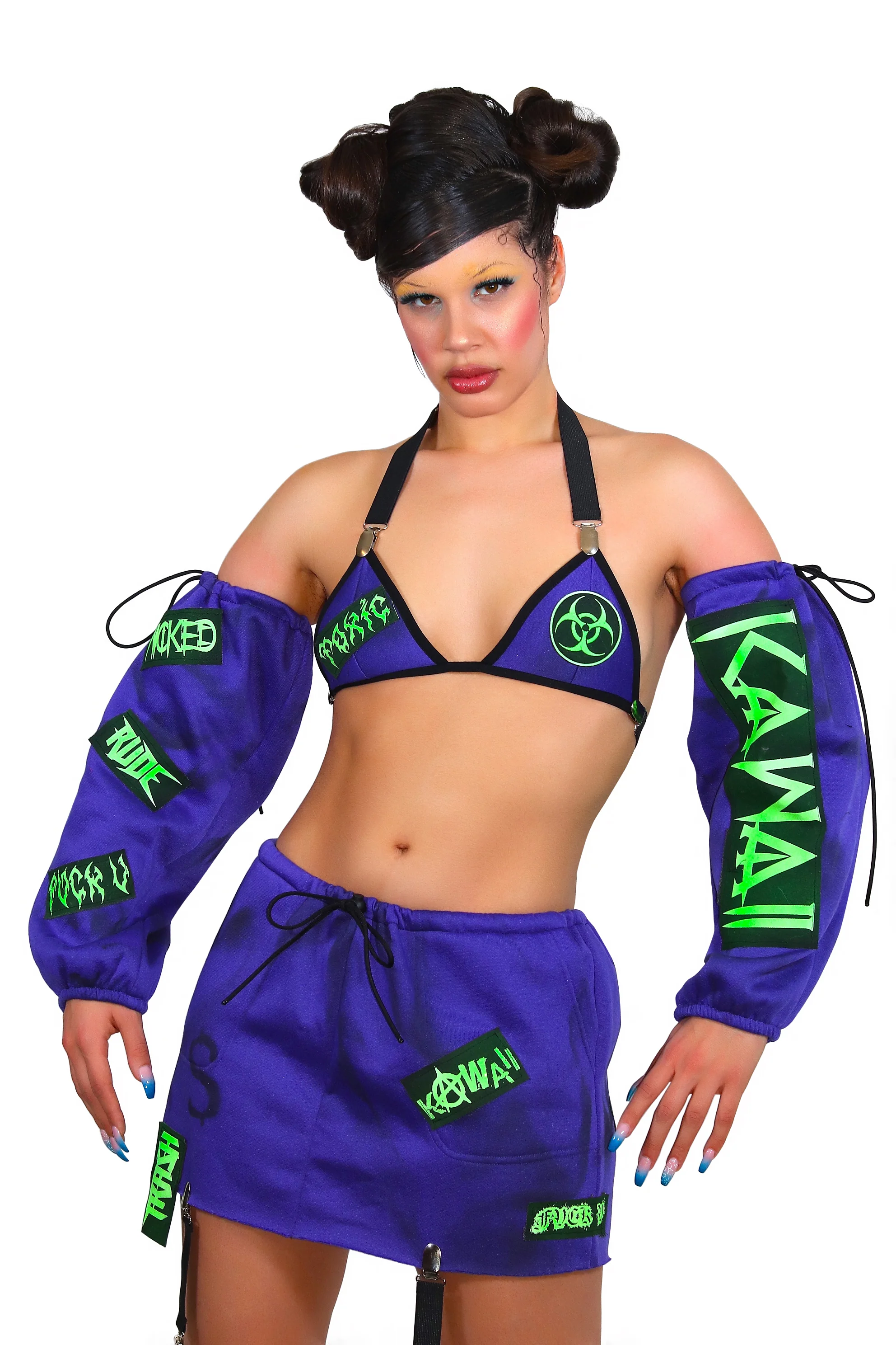 This set is made out of reworked soft fleece joggers and embellished with patches. It includes BRA, SKIRT, AND SLEEVES.