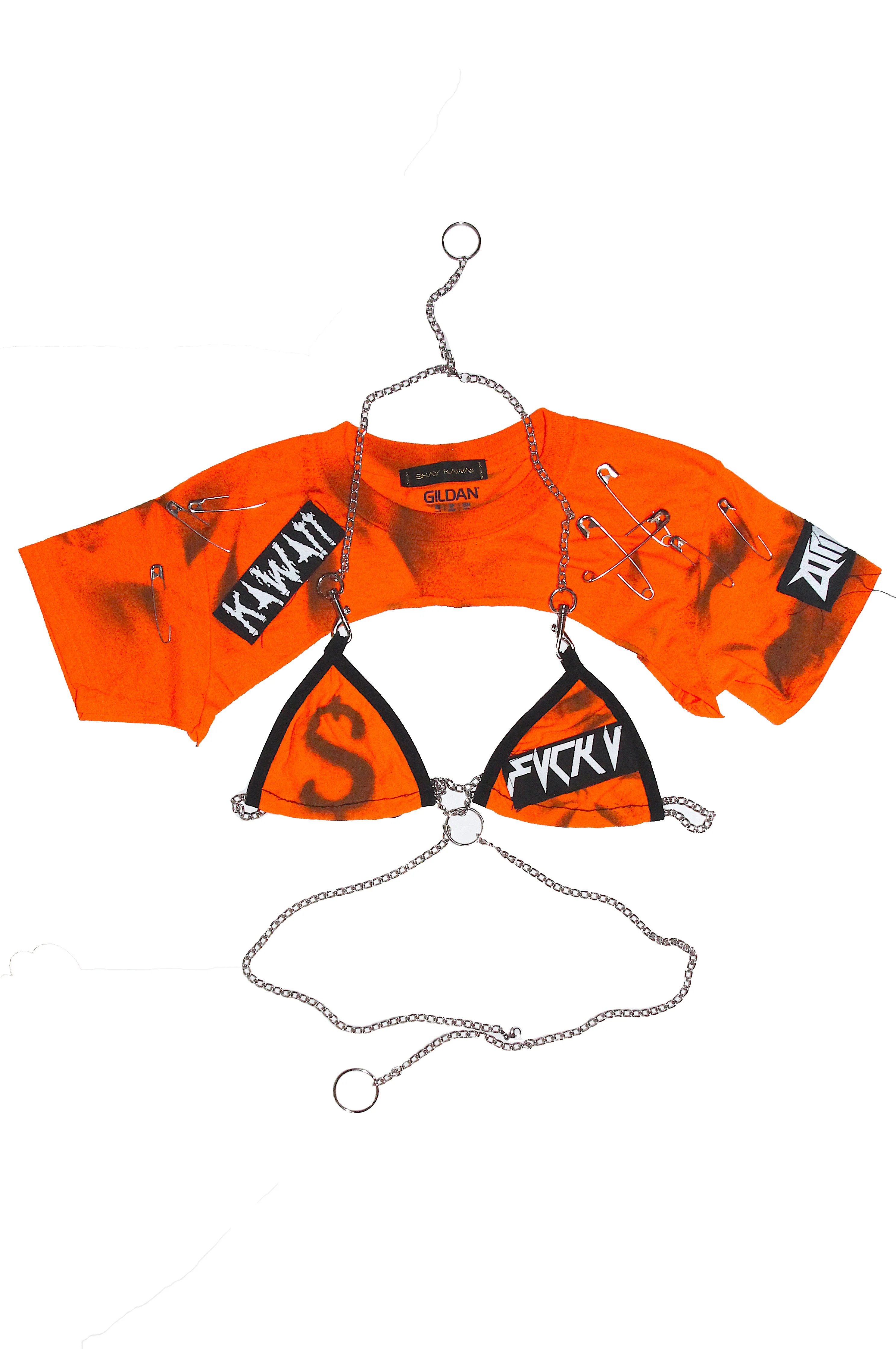 Top made out of a reworked t-shirt, embellished with denim patches, chains, and jumbo safety pink