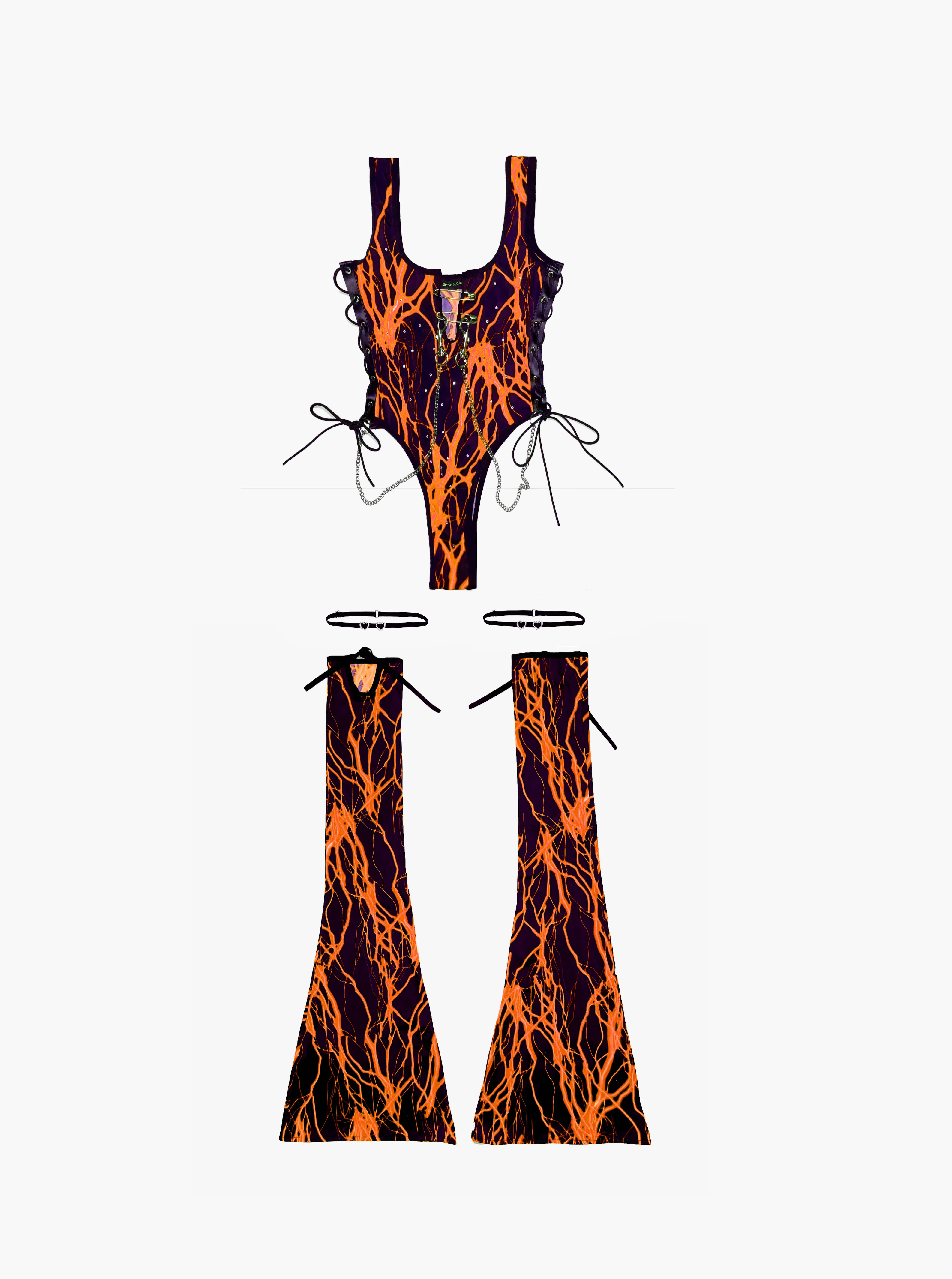This onesie is embellished with rhinestones and completely adjustable with laces along the sides.