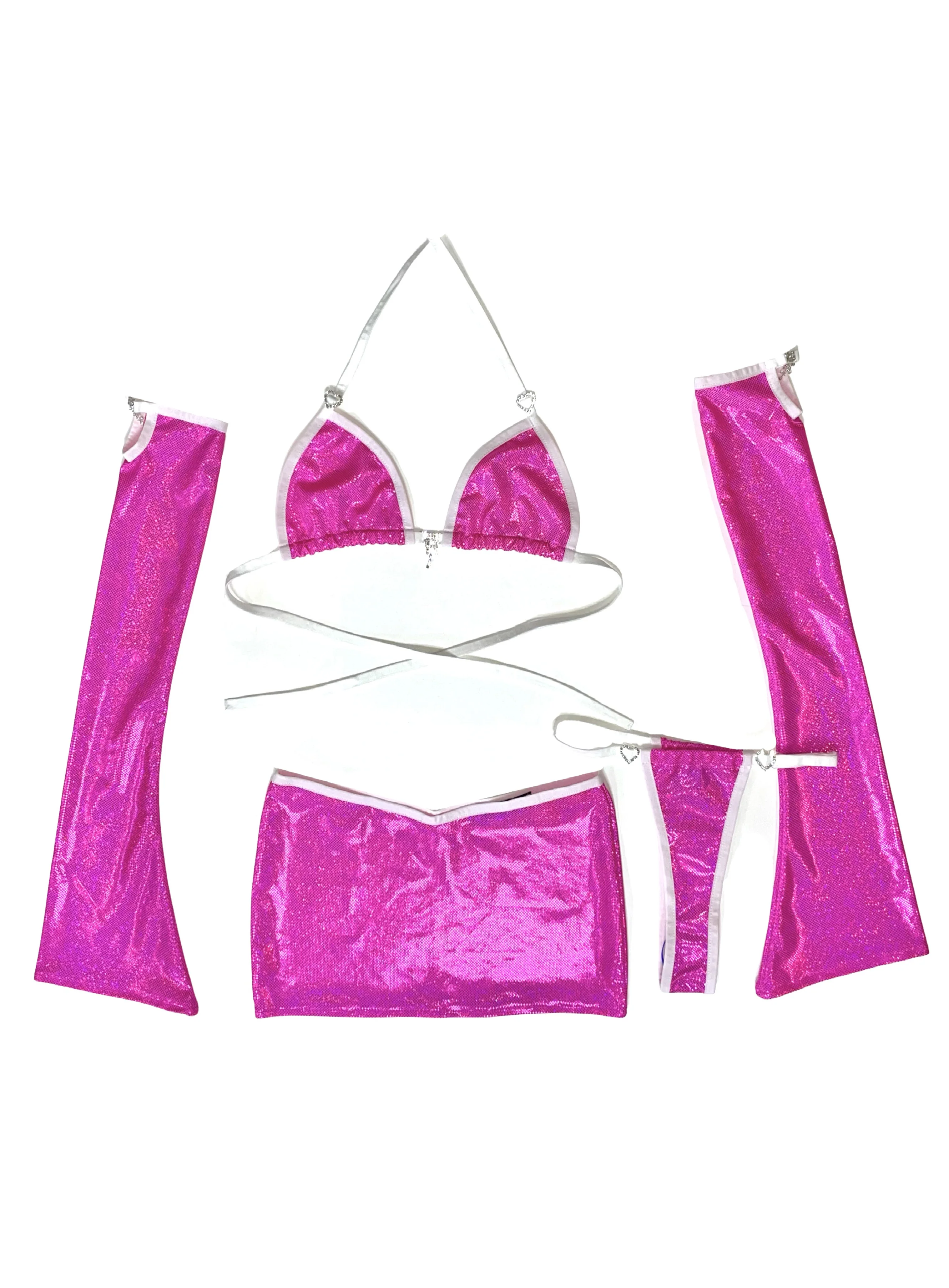 This set is made out of a stretchy fabric. It includes BRA, THONG, SKIRT, & SLEEVES.