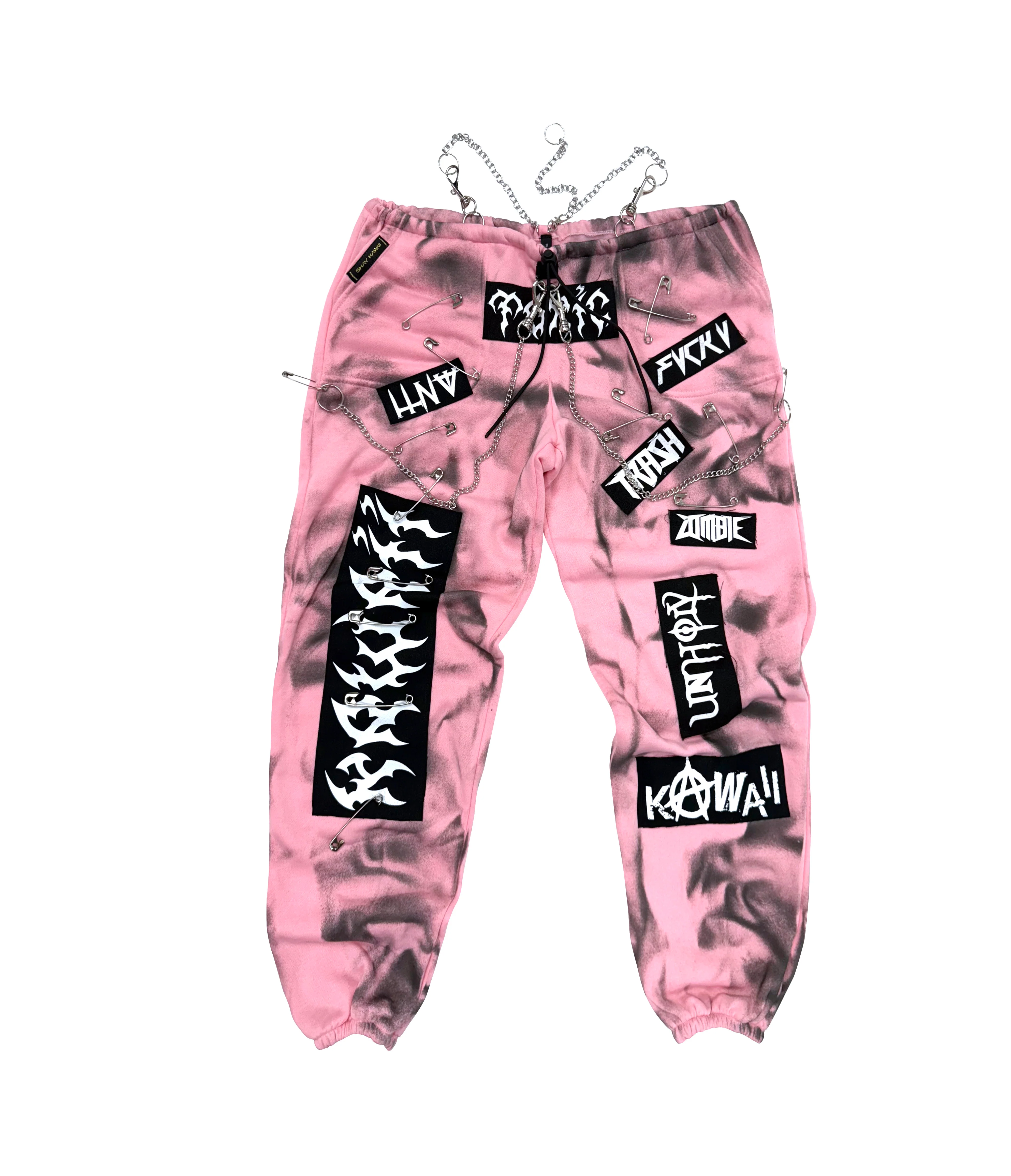 These UNISEX pants are made out of reworked fleece jogger pants, and embellished with denim patches, safety pins, and chains at the waist.