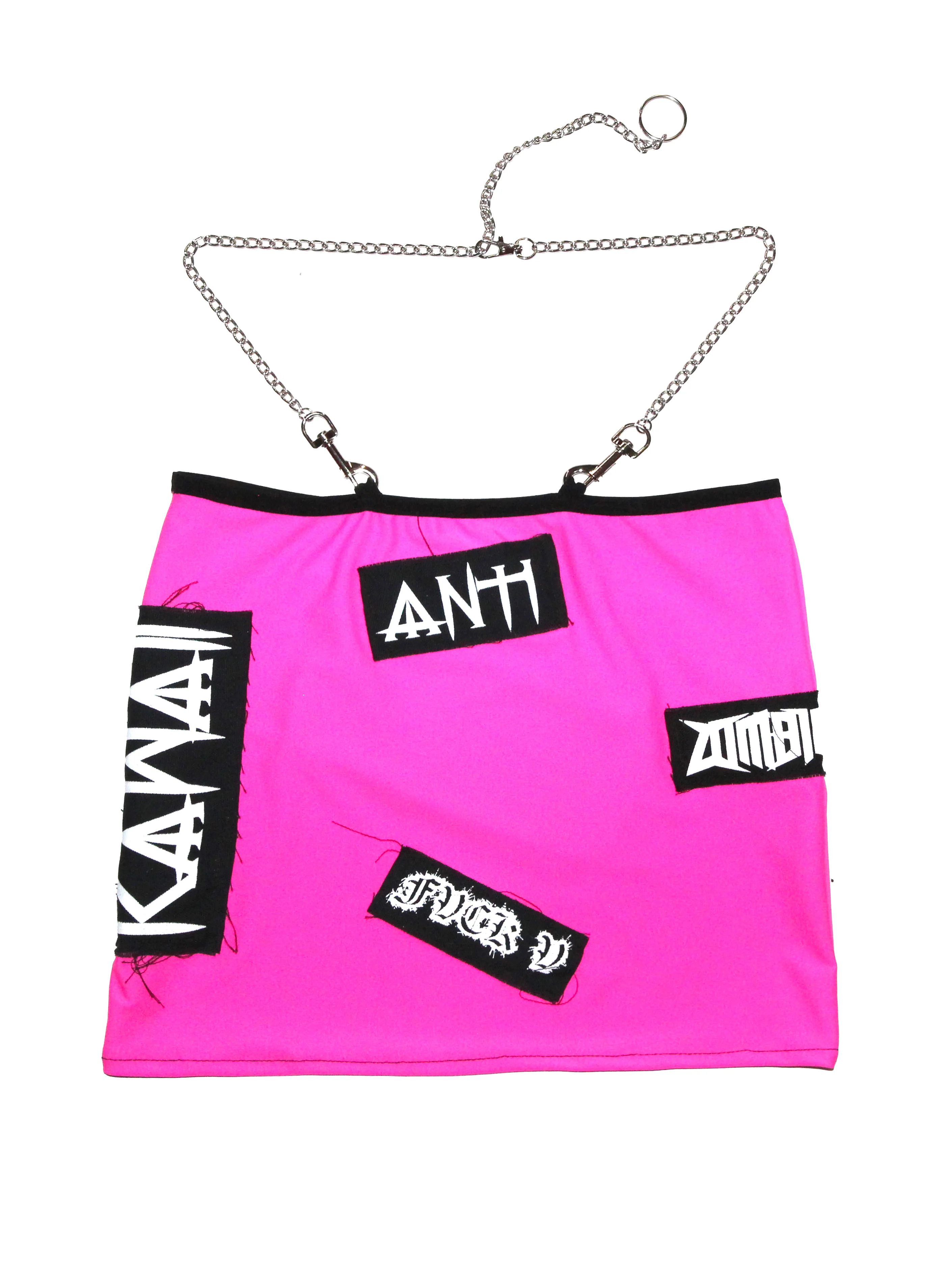 This item is made out of stretchy spandex fabric , embellished with a waist chain and denim patches.