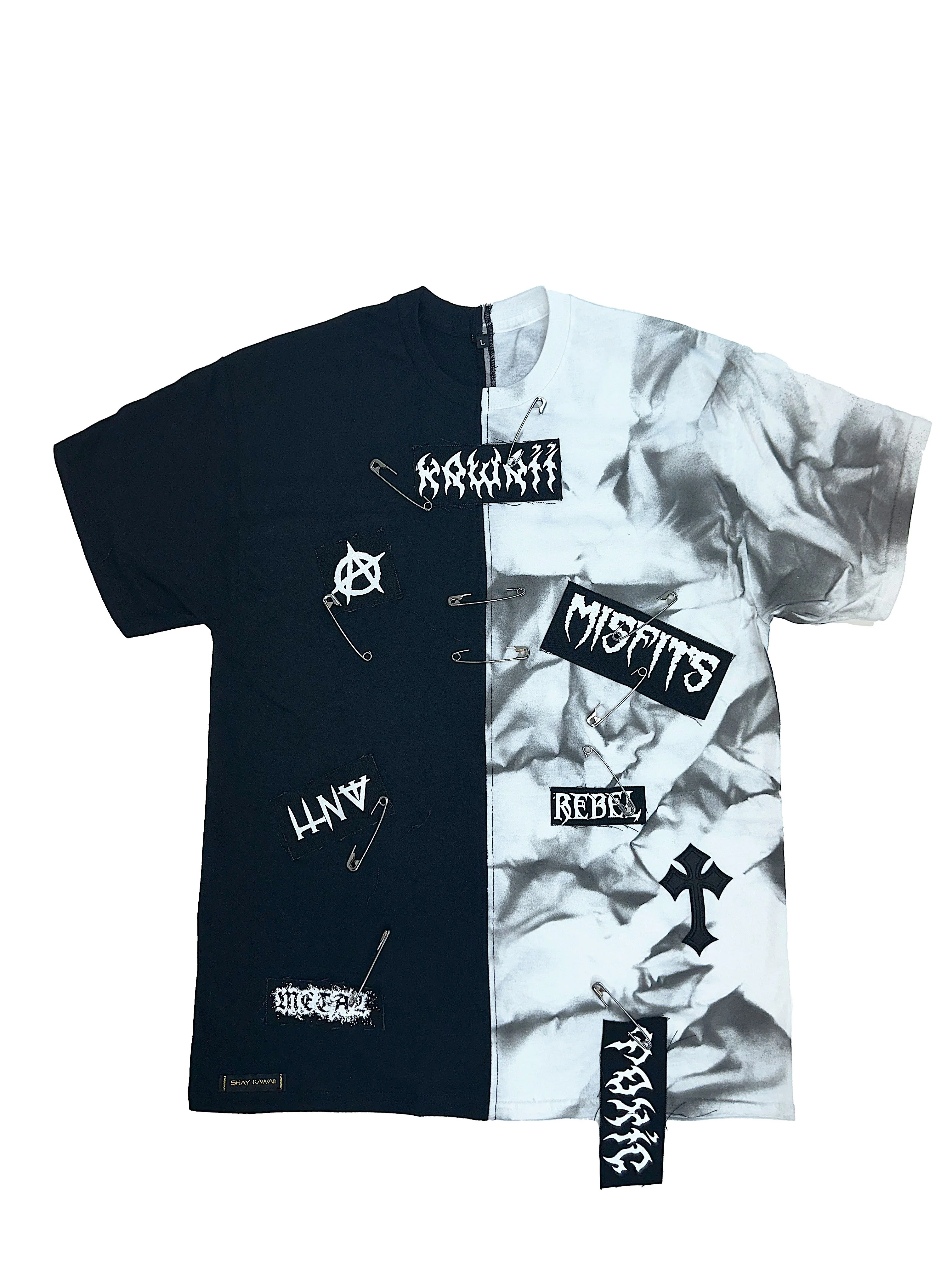 These UNISEX TEES are made out of reworked t-shirts, and embellished with denim patches and safety pins.